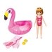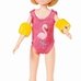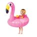 Aprengta vientisu maudymosi kostiumėliu ant kurio nupieštas flamingas. Ant rankų turi pripučiamus plaukmenis, kad saugiau būtų plaukioti.