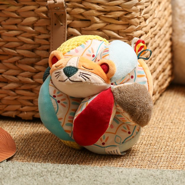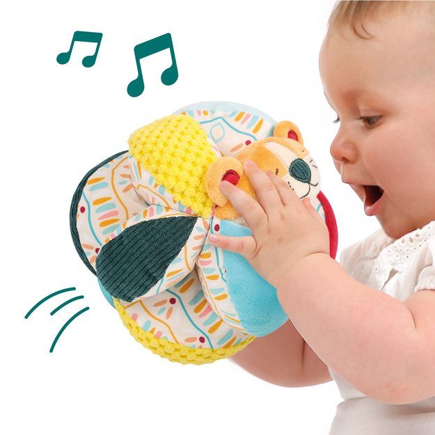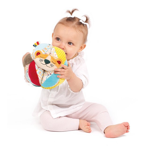 - Spalvingi raštai ir miela liūto galvytė puošia kamuoliuką ir pritraukia mažylio dėmesį.