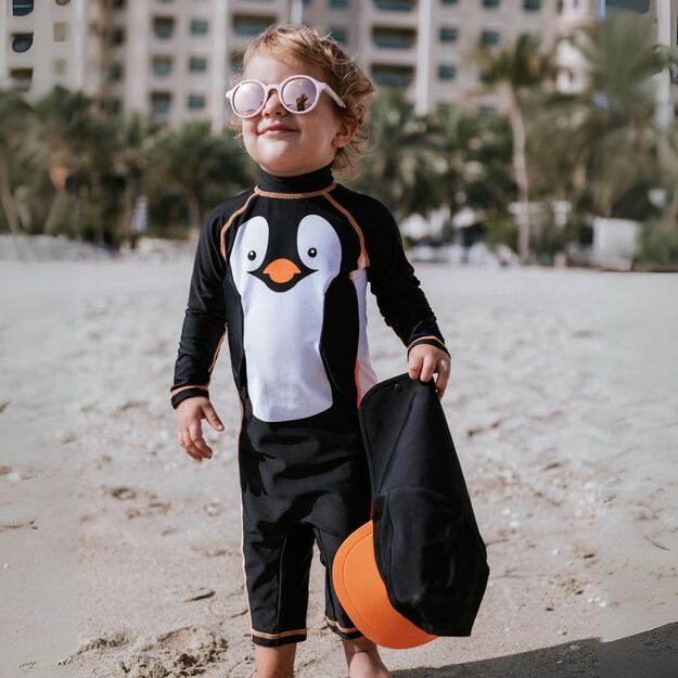 Šis maudymosi kostiumėlis turi kepurę su prailgintu snapeliu, kuri padeda pasislėpti nuo saulės spindulių, todėl žaisti lauke tampa maloniau. Kepurė saugiai prisitvirtina prie kostiumo spaudėmis.