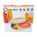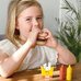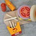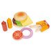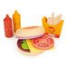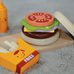 Rinkinyje žaislinis sumuštinis pagamintas iš 5 skirtingų dalių, 2 padažų buteliukai ir 5 bulvytės fri specialioje dėžutėje.