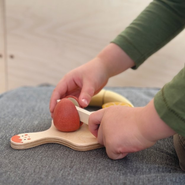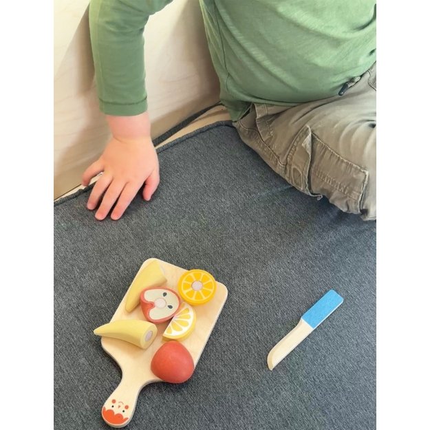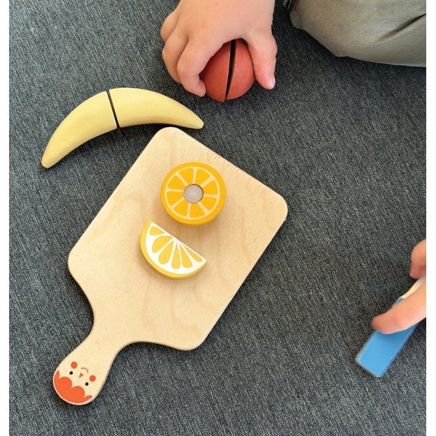 Rinkinyje yra: pjaustymo lentelė ir žaislinis peilis su 3 mediniais vaisiais (obuolys, bananas, apelsinas), kurie pasidalina į 2 dalis.