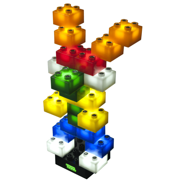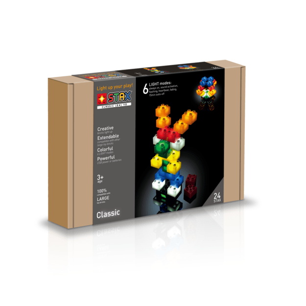 24 šviečiančios 2x2 STAX kaladėlės (mėlynos - 4 vnt., žalios - 4 vnt., geltonos - 4 vnt., oranžinės - 4 vnt., raudonos - 4 vnt., baltos - 4 vnt.)